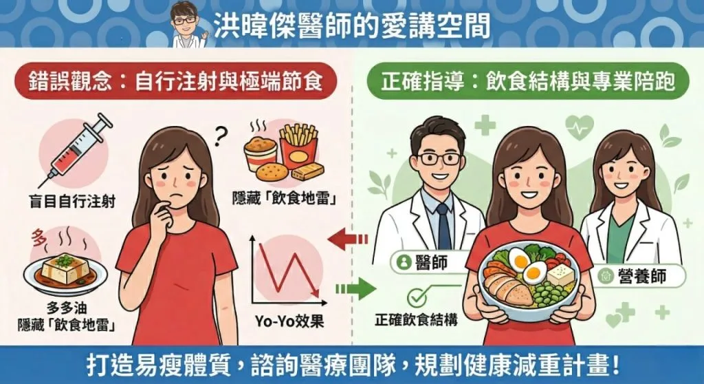 千萬不要自己私下買針來打!藥物皆有副作用,未經醫師評估與營養師的飲食調控,不僅容易導致肌肉快速流失,停藥後還會發生嚴重的報復性進食。